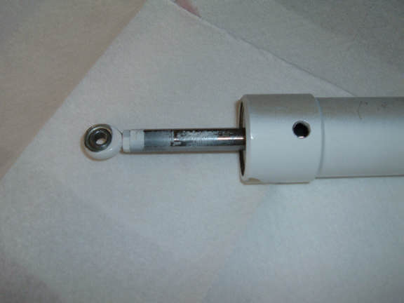 I started to remove the actuator to troubleshoot the leak, When I removed the bolt for the piston rod end bearing and swung it down, I noticed there was a lot of paint overspray on the piston shaft. Paint on the shaft was fouling the shaft o-ring and not allowing it to make a good seal.