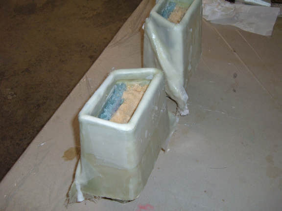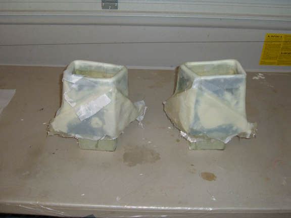 The intake ducts are now glassed on the bottoms and sides. After they cure, I'll clean out the foam from the center duct. Once the outer skin is filled, sanded, primed and painted, theses will be floxed in place on each side of the aft turtle deck.