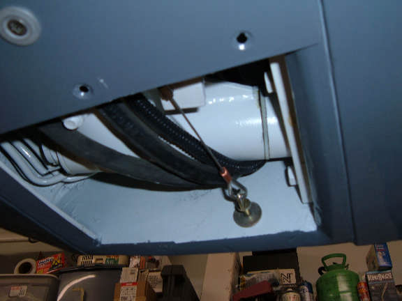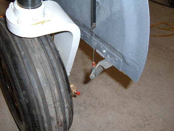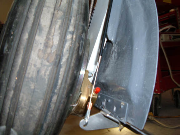 This photo shows the gear partially retracted, the gear is about 18 inches below the wheel well. This rigging and cable is temporary with makeshift parts. It purpose is a proof of concept of the rigging and geometry of the cable required to pull the small grasscutter door closed. And also verify the routing so as not to interfere with the other cables or hoses, and the location of clamps required to secure the cable.