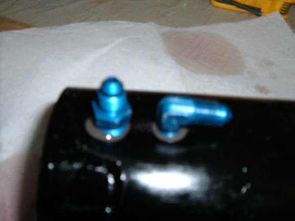 Sorry for the bad focus, This is the exterior of the reservoir. These two fittings are VENT lines. The 90 deg fitting goes to the Emergency Blow Down valve. When the Emergency Blow Down valve is used, the UP pressure fluid is routed to this line.
